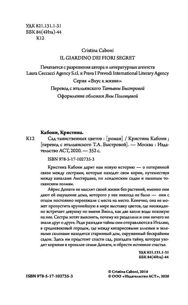 Серия: Вкус к жизни Кристина Кабони дарит нам новую историю о потерянной связи между сестрами, которые находят свои корни, путешествуя между каналами Амстердама, по лондонским садам и пышным тосканским холмам. |