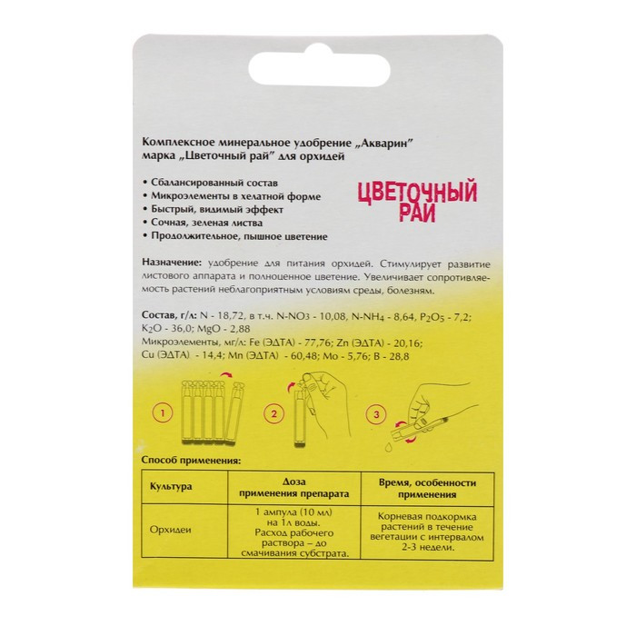 Буйский химический завод Удобрение комплексное жидкое для орхидейВ данный момент этот товар отсутствует в продаже. Возможно, у нас найдется аналогичный или похожий товар здесь. Сбалансированный комплекс высокоэффективных, легкодоступных для растений микроэлементов — Fe, Mn, Zn, Cu, в виде сложных органических солей — хелатов, а также B, Mo. За счет этих элементов способствует здоровому росту и развитию растений. Стимулирует развитие побегов, сочной зеленой листвы, обильного и длительного цветения. Устраняет видимые проявления дефицита элементов питания, предотвращает развитие болезней, вызванных недостатком тех или иных микроэлементов. |