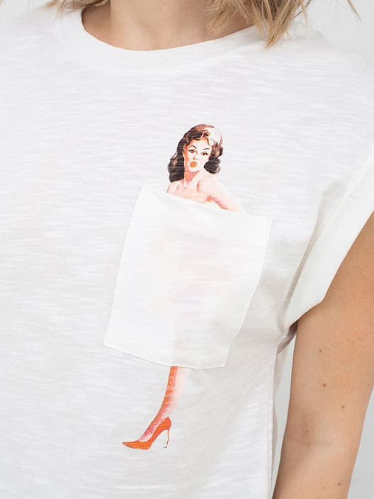 Симпатичная футболка, но ооочень широкая. В пройме рукавов видно нижнее белье... Коротенькая, но это модель так задумана