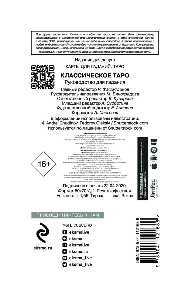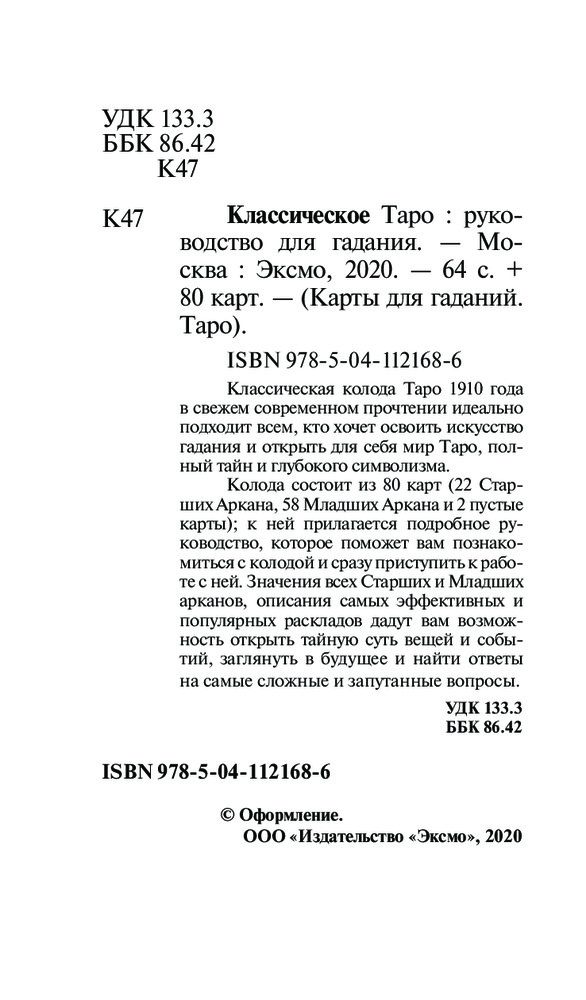 💳 Оплатить за товар можно при получении 🇰🇿 Есть бесплатная доставка по Казахстану от 1 дня 🎁 Копите бонусы с каждой покупки Серия: Карты для гаданий. Таро Классическая колода таро 1910 года в свежем современном прочтении идеально подходит всем, кто хочет освоить искусство гадания и открыть для себя мир Таро, полный тайн и глубокого символизма. Колода состоит из 80 карт (22 Старших Аркана, 56 Младших Арканов и 2 пустые карты); к ней прилагается подробное руководство, которое поможет вам познакомиться с колодой и сразу приступить к работе с ней. Значения всех Старших и Младших арканов, описания самых эффективных и популярных раскладов дадут вам возможность открыть тайную суть вещей и событий, заглянуть в будущее и найти ответы на самые сложные и запутанные вопросы. |