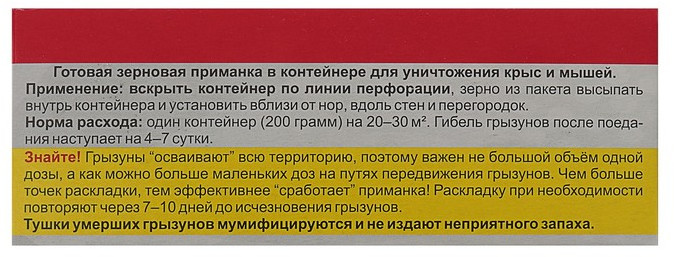 Зерна много окрашено в ярко розовый цвет .Крысы по участку ходили стаями .Когда посыпала приходили всей семьёй пировать .Гибнут не сразу через несколько дней это специально чтобы умные грызуны на связали свою гибель с этой едой. Крысы на участке пропали наслаждаюсь тишиной. Трупов не видно видимо ушли куда-то помирать. Буду брать ещё по цене выгоднее чем тесто брикеты их всего 6 штук.