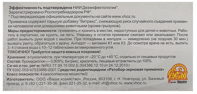 Беру второй раз.Подсыпаю время от времени на даче.Крысы приходят с соседних участков и если не травить будут табунами ходить.Время от времени нахожу на участке мумифицированные трупики грызунов.заявленным характеристикам отрава соответствует.