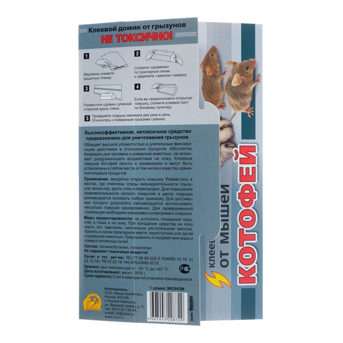 Ваше хозяйство Домик клеевой от мышейВ данный момент этот товар отсутствует в продаже. Возможно, у нас найдется аналогичный или похожий товар здесь. Серия: Котофей Высокоэффективное, нетоксичное средство предназначено для уничтожения грызунов. Обладает высокой уловистостью и длительным фиксирующим действием в отношении грызунов. Абсолютно безвредно для человека и домашних животных, не оказывает раздражающего воздействия на кожу. Клеевые ловушки Котофей просты в применении и могут быть установлены в любом месте, в том числе и в местах хранения пищевых продуктов. |