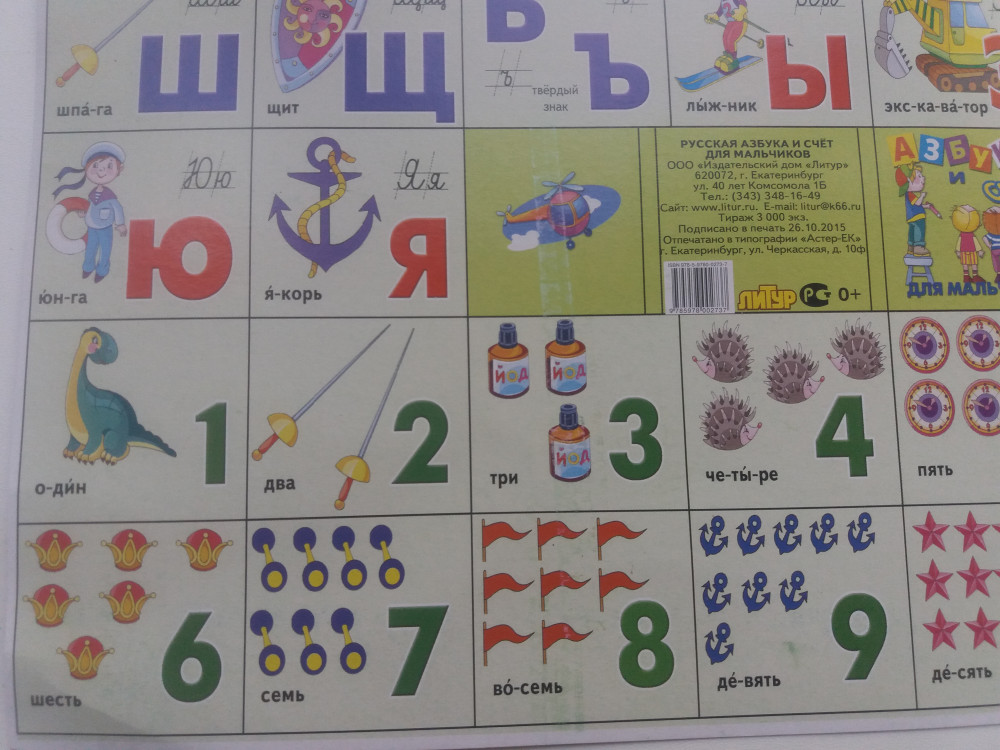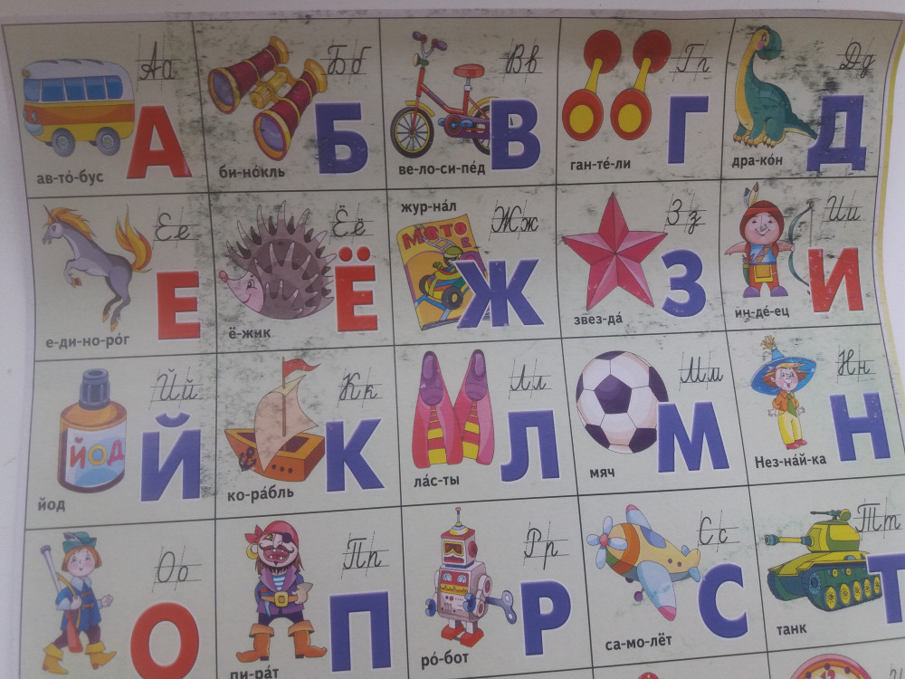 Мне не понравилась эта азбука. Если хотите начать изучать буквы, брать не стоит, картинки мелкие и не яркие, всё сливается. И не видно где и что написано.