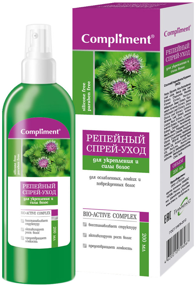 Compliment Спрей-уход для укрепления и силы волос репейный+21 мягкость послушность травяной запах уменьшение выпадения восстановление