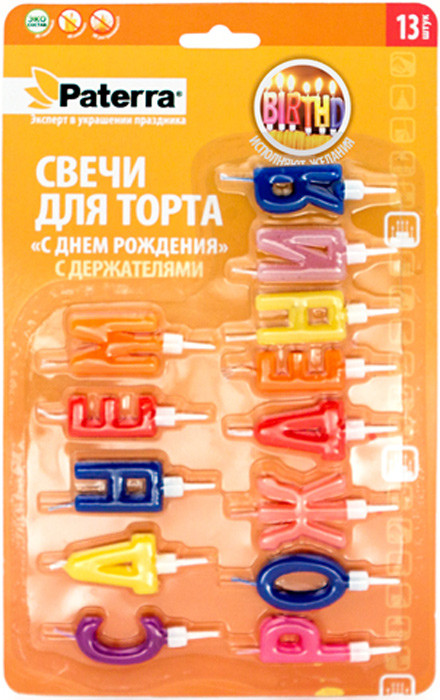 Paterra Набор свечей для торта «С днем рождения»Буквы выглядят симпатично. Неустойчивость свечей: они плохо держатся на подставке и падают. Буквы ломаются во время горения. В данный момент этот товар отсутствует в продаже. Возможно, у нас найдется аналогичный или похожий товар здесь. Свечи для торта «С днем рождения!» изготовлены из высококачественного парафина, с фитилями из натуральных волокон. Они представляют собой буквы, из которых можно выложить надпись — с днем рождения. Такие свечи предназначены для декорирования праздничных тортов. Не растрескиваются, горят без искр. |