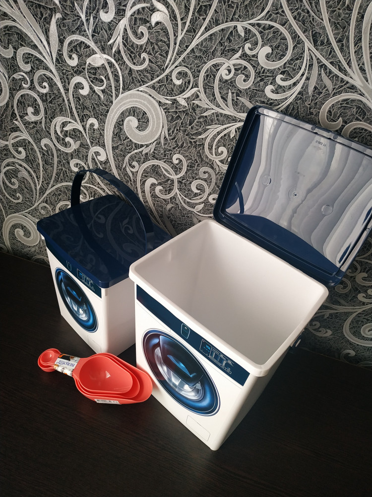 На фото выглядит салатовым цветом, но как в описаний он желтого цвета. В деле еще не использовала, пластик хороший не пахнет для риса, гречки и вермишелей самое то, думаю совок +мерная ложка хорошая идея для экономии места в кухне