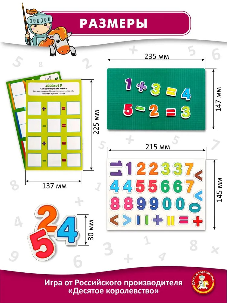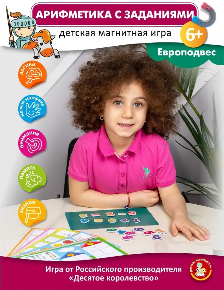 💳 Оплатить за товар можно при получении 🇰🇿 Есть бесплатная доставка по Казахстану от 1 дня 🎁 Копите бонусы с каждой покупки Серия: Магнитные истории Игра магнитная «Арифметика с заданиями» является вспомогательным материалом для обучения ребенка счету. Данный набор постепенно, шаг за шагом, поможет Вашему ребенку познакомиться с цифрами, запомнить их написание, освоить математические понятия, научиться считать и производить простейшие арифметические действия (сложение, вычитание, деление и умножение). |