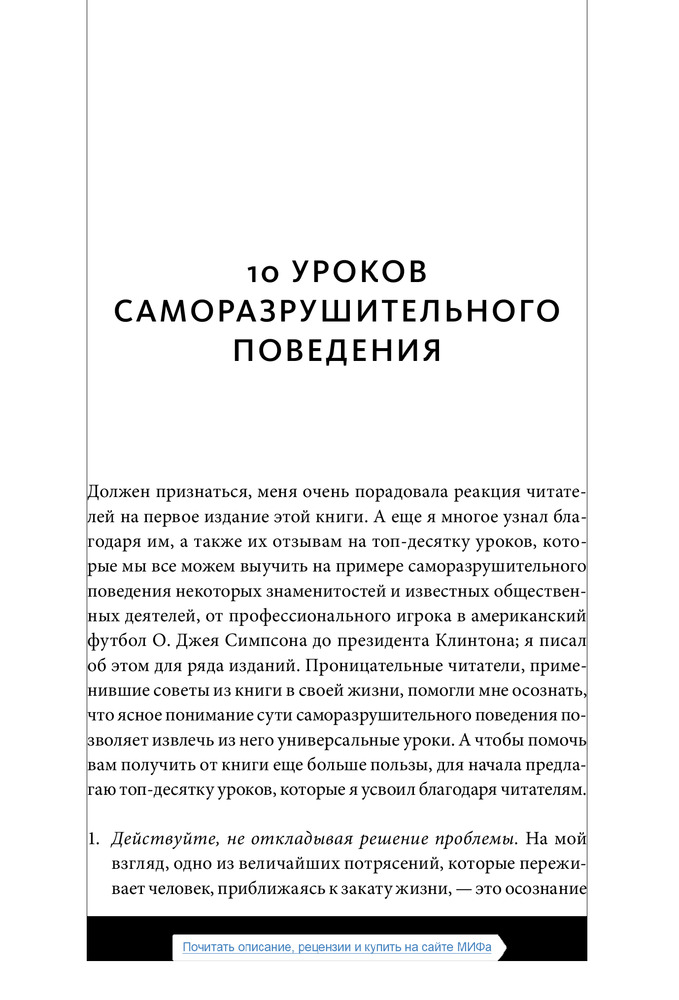 «Ничто так не выводит нас из себя — и не заставляет сильнее себя ненавидеть, — чем осознание того, что мы сами мешаем себе обрести любовь, достичь успеха и испытать счастье — словом, получить то, о чем мечтаем. И все это последствия саморазрушительного поведения. Оно не дает нам иметь в жизни то, чего мы больше всего хотим; оно работает против наших интересов.».