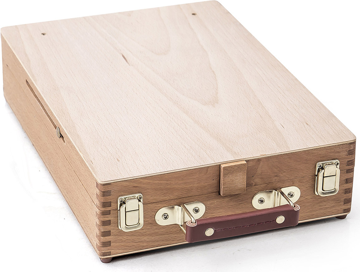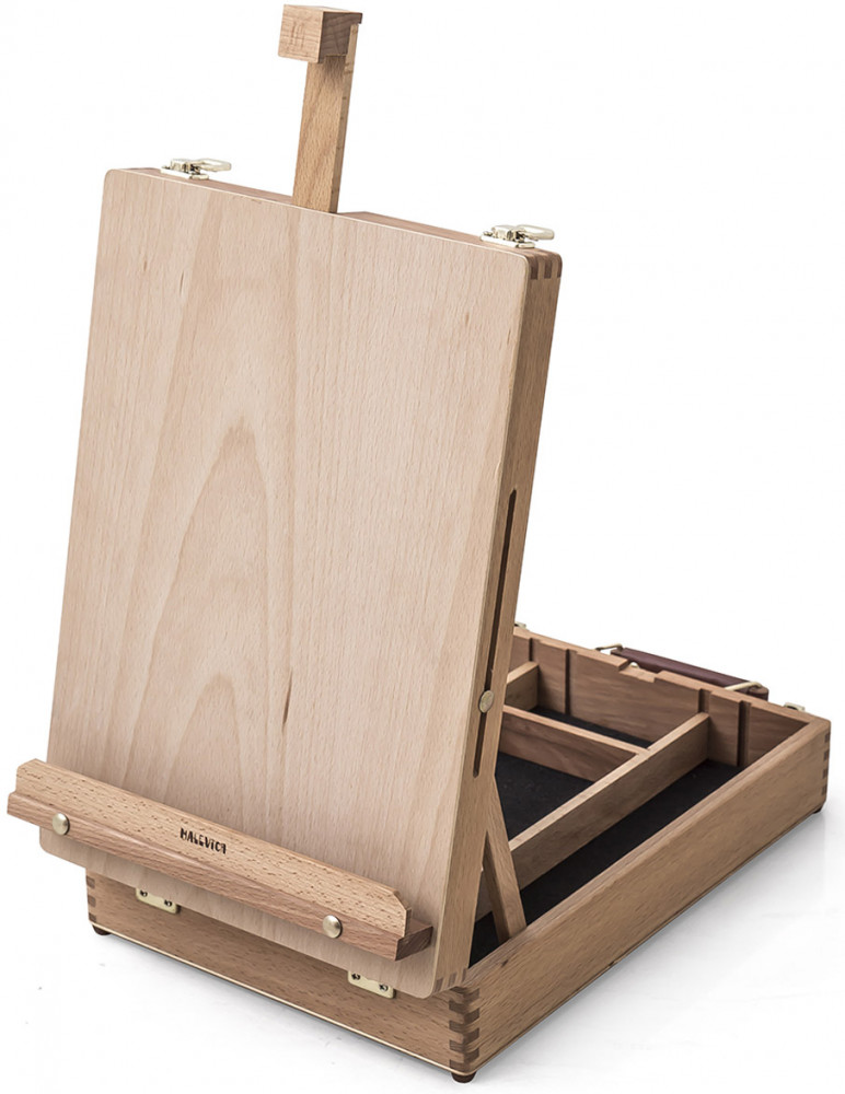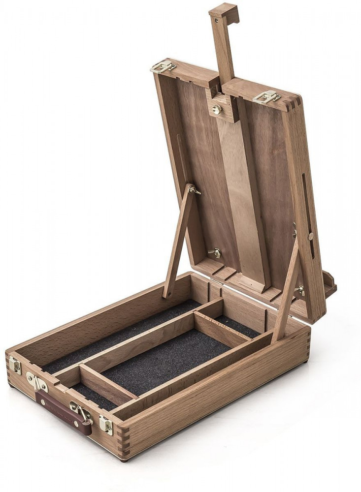 Настольный этюдный ящик МЛ-34 — настольный мольберт выполнен из промасленного бука. Полка для холста фиксируется «барашками», а верхний зажим для холста регулируется специальным винтом с задней стороны мольберта. В ящик вы можете положить любые принадлежности для живописи, перегородки в ящике съемные. На торце есть ручка из кож. зама для удобной переноски. На дне мольберта предусмотрены антискользящие упоры. Это компактный вариант, отлично подходящий для живописи на небольших холстах. |