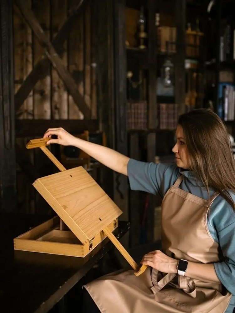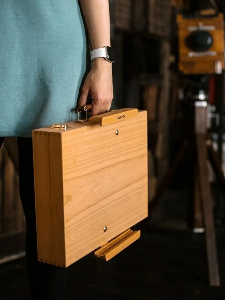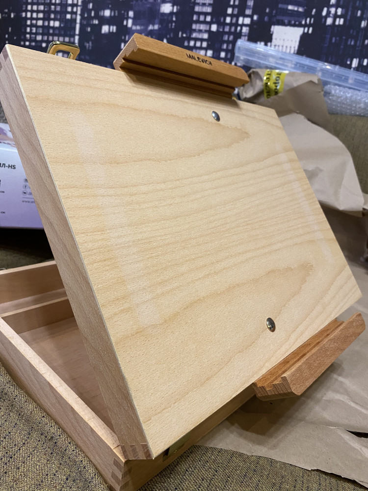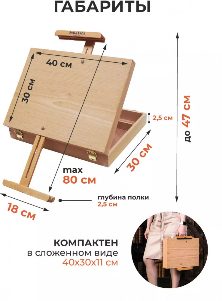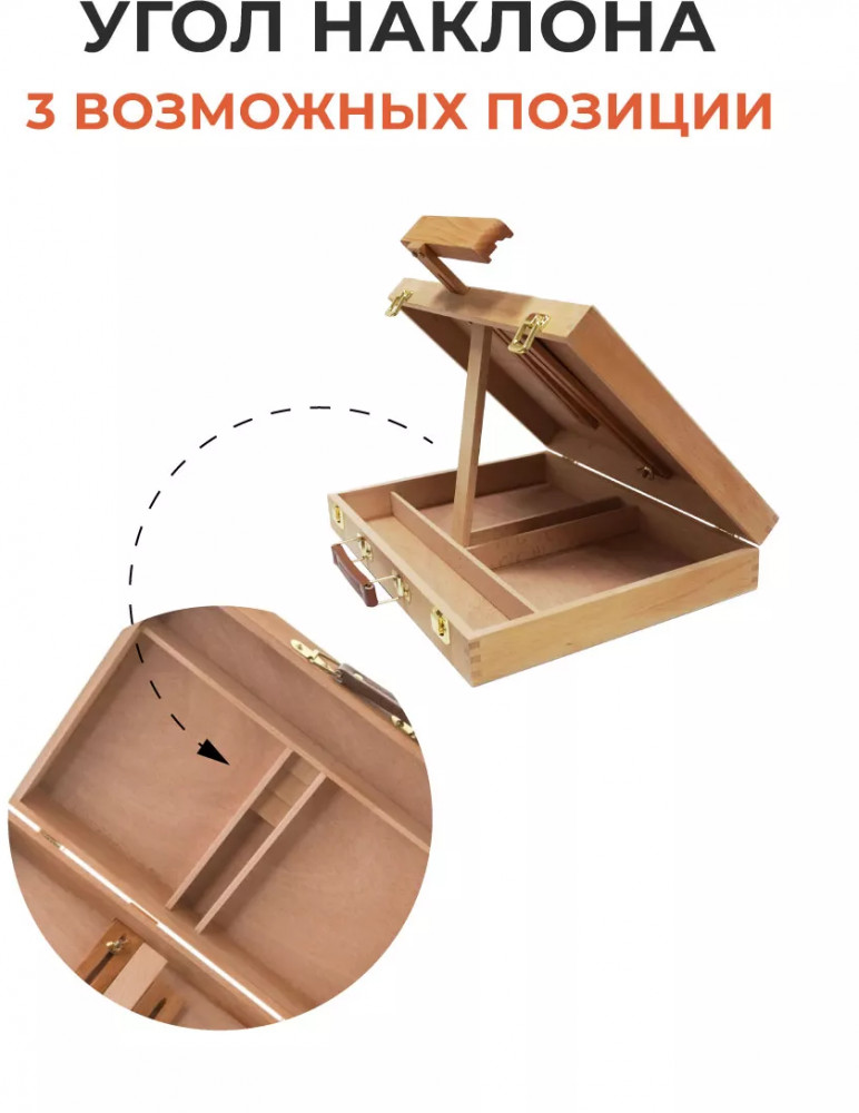 💳 Оплатить за товар можно при получении 🇰🇿 Есть бесплатная доставка по Казахстану от 1 дня 🎁 Копите бонусы с каждой покупки Настольный этюдный ящик из промасленного бука во французском стиле (с креплением холста на обратной стороне доски). Буковая древесина — очень прочный материал, традиционно использующийся для производства профессиональных мольбертов, а английский бук отличается от других сортов более выраженной текстурой и более темным, благородным цветом. Крепления и фурнитура изделия выполнены из устойчивого к коррозии металлического сплава красивого золотистого цвета. |