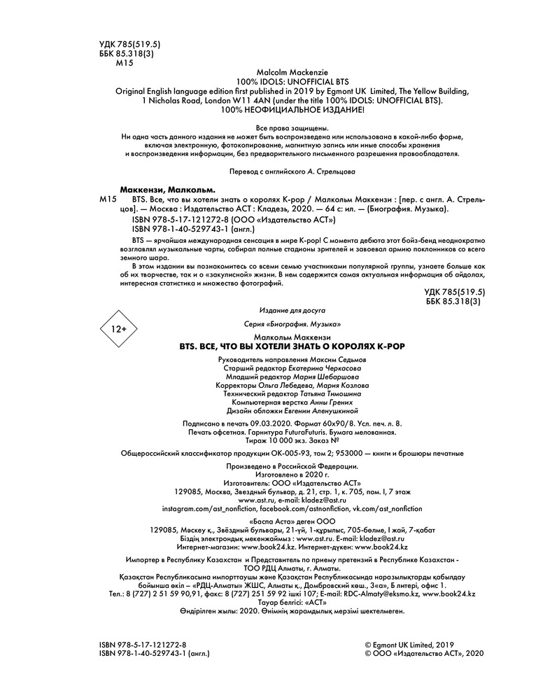 💳 Оплатить за товар можно при получении 🇰🇿 Есть бесплатная доставка по Казахстану от 1 дня 🎁 Копите бонусы с каждой покупки Серия: Биография. Музыка (подарочная) BTS — ярчайшая международная сенсация в мире K-pop! С момента дебюта этот бойз-бенд неоднократно возглавлял музыкальные чарты, собирал полные стадионы зрителей и завоевал армию поклонников со всего земного шара. В этом издании вы познакомитесь со всеми семью участниками популярной группы, узнаете больше как об их творчестве, так и о «закулисной» жизни. В нем содержится самая актуальная информация об айдолах, интересная статистика и множество фотографий. |