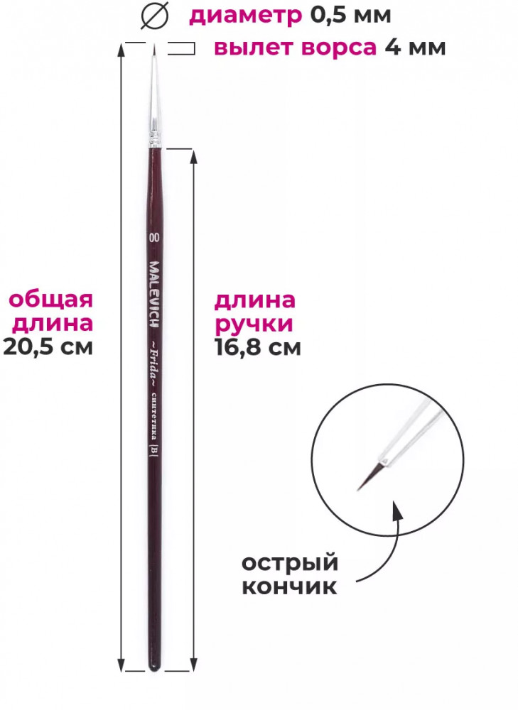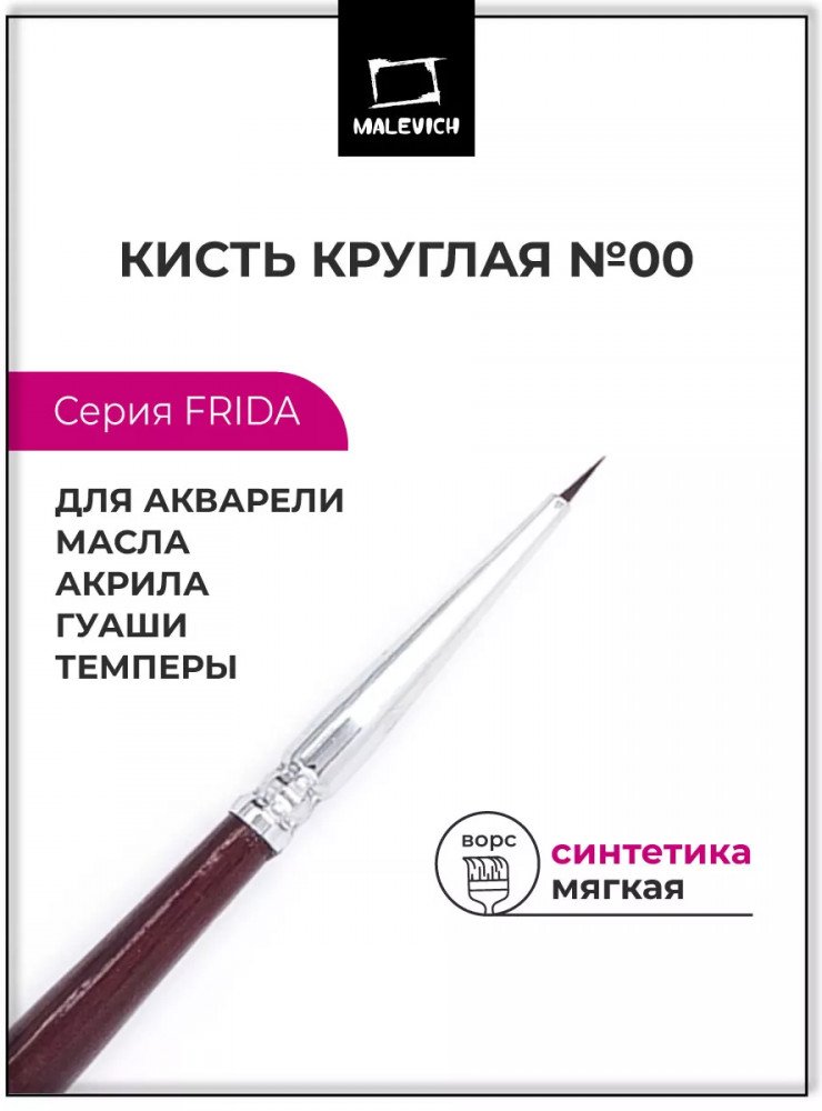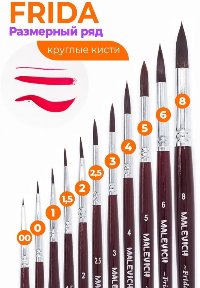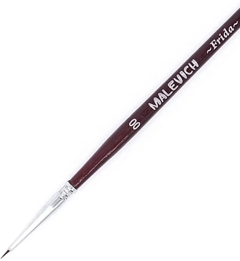 МалевичЪ Кисть «Frida»тонкая кисть хорошая кисть качество кисти В данный момент этот товар отсутствует в продаже. Возможно, у нас найдется аналогичный или похожий товар здесь. Серия: Frida Синтетические нейлоновые кисти серии «Frida» от Малевичъ — это кисти с мягким эластичным ворсом. Имеют острый кончик, который долго не стирается. Подходят для акварели и гуаши, хороши для академической техники живописи и лессировок, хорошо держат воду. По свойствам напоминают натуральную белку. Латунная обойма с антикоррозийным покрытием и двойным обжимом. Березовая ручка длиной 18см покрыта глянцевым темно-красным лаком. Длина ворса (выставка) короткая. Номер кисти соответствует диаметру в мм. |