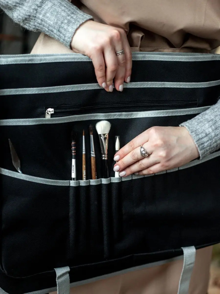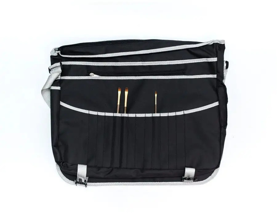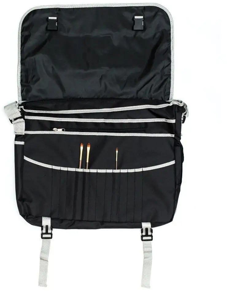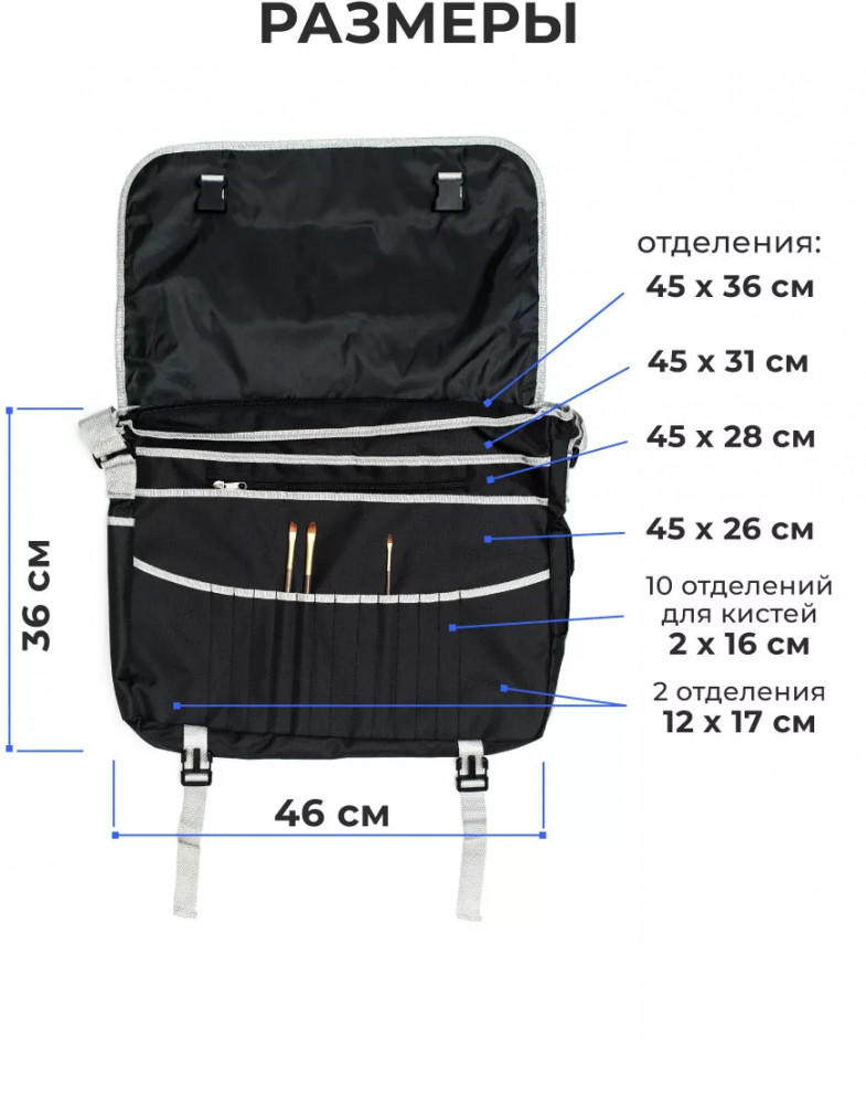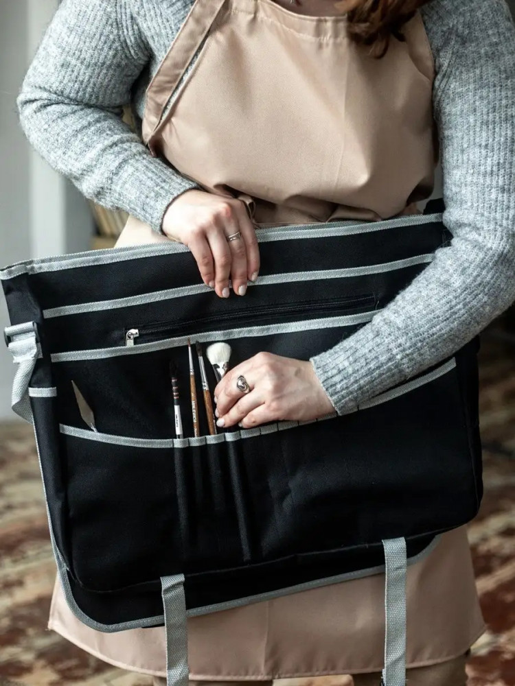Отличная сумка! Легко вмещает формат А3.Качественный влагостойкий материал,очень прочный.Три отделения плюс для карандашей , ручек,кистей.