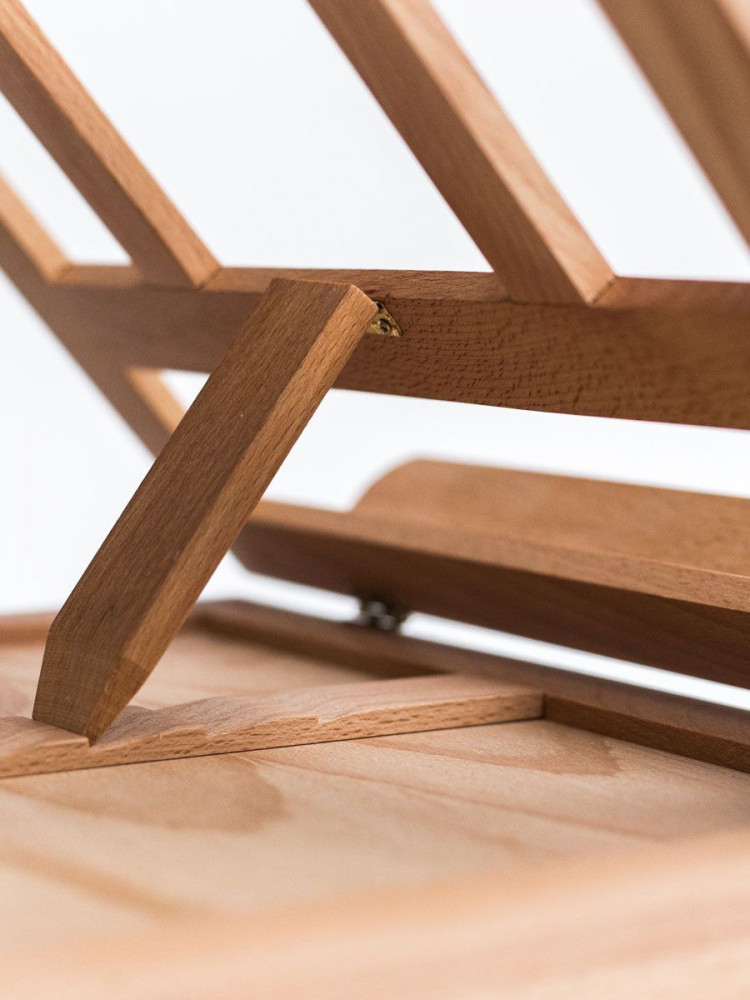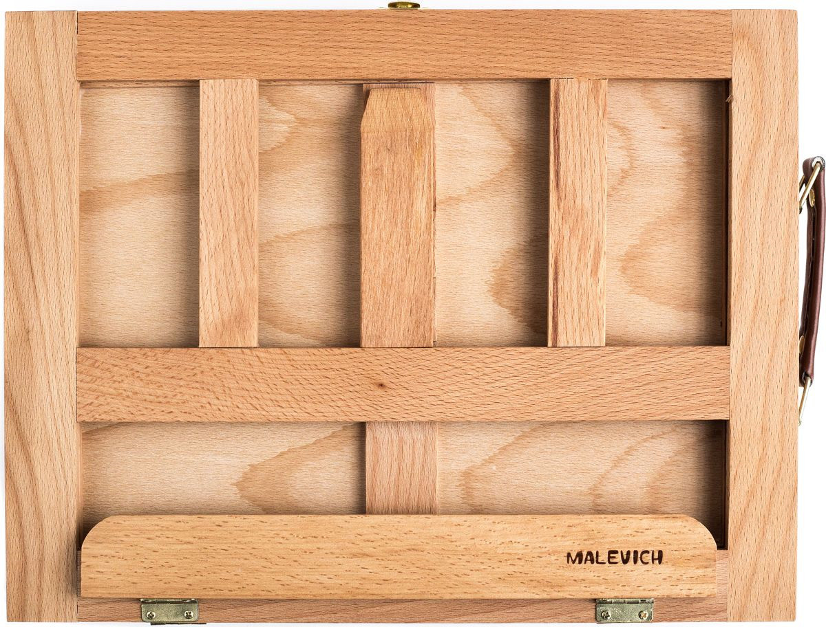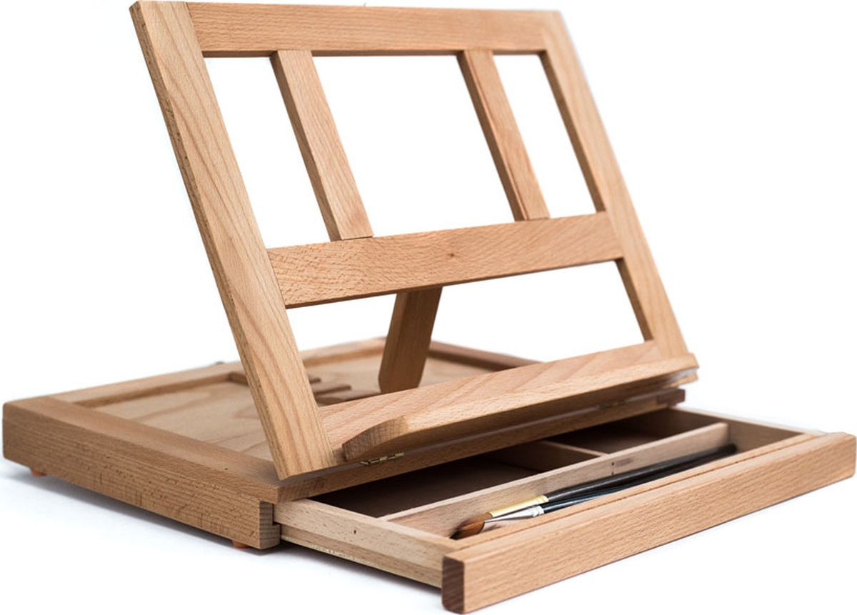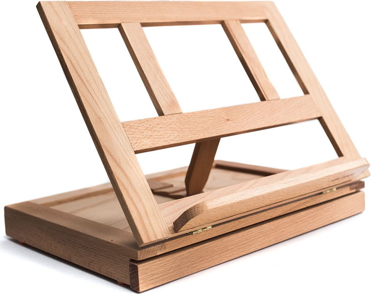 Настольный мольберт с выдвижным ящиком отлично подходит для акварели и пастели. На мольберте можно закрепить планшет с бумагой, а в ящике хранить кисти, краски или пастель. Угол наклона регулируется. Выполнен из промасленного бука. Максимальная высота холста: 30 см. |