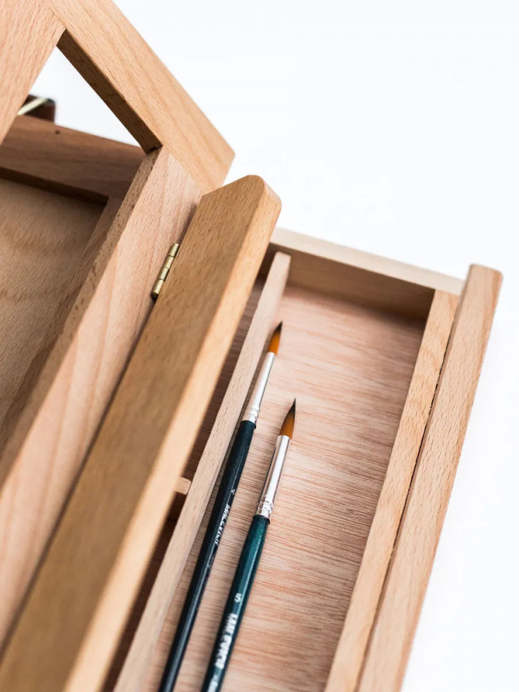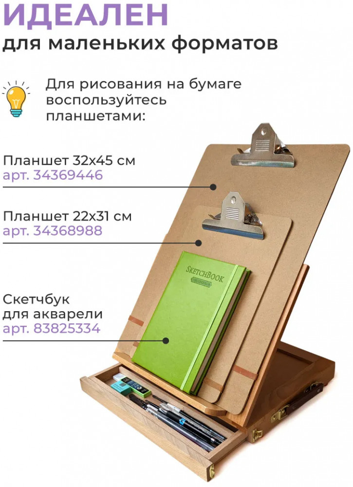 💳 Оплатить за товар можно при получении 🇰🇿 Есть бесплатная доставка по Казахстану от 1 дня 🎁 Копите бонусы с каждой покупки Настольный мольберт с выдвижным ящиком отлично подходит для акварели и пастели. На мольберте можно закрепить планшет с бумагой, а в ящике хранить кисти, краски или пастель. Угол наклона регулируется. Выполнен из промасленного бука. Максимальная высота холста — 30 см. Ширина — 34,5 см, глубина — 26 см, высота — от 6,5 до 27 см. Вес — 1,4 кг. |
