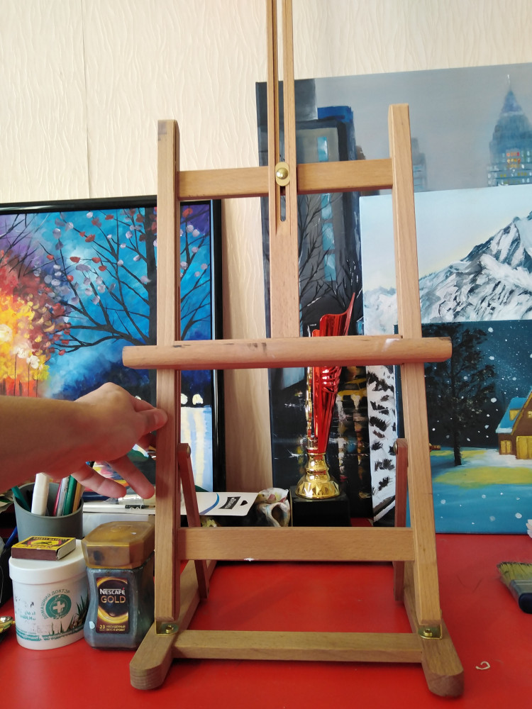 Мольберт отличный! Очень удобный, не много места занимает на столе, регулируется наклон и размер для холста. Пока несколько раз использовала, нареканий нет. Пришел целый без повреждений, в пленке и большой коробке