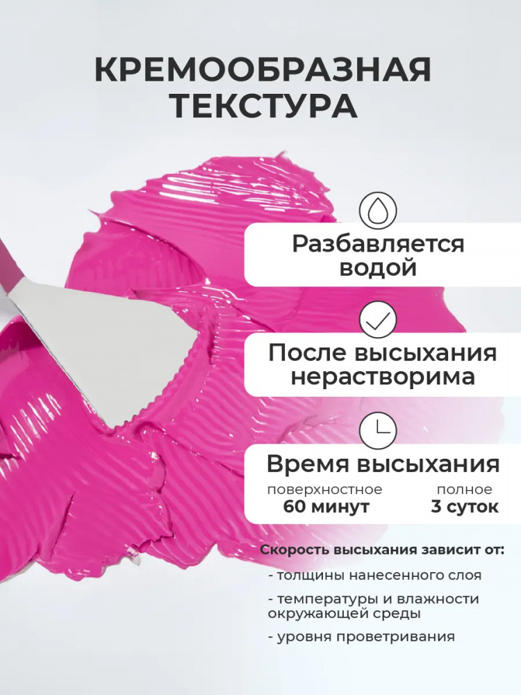 краска густоватая что можно разбавить водой ,но только не много если больше воды добавить то цвет будет светлый белый