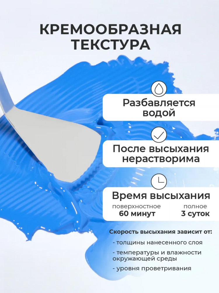 краска густоватая что можно разбавить водой ,но только не много если больше воды добавить то цвет будет светлый белый