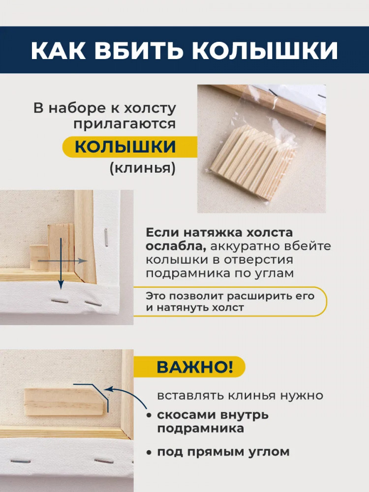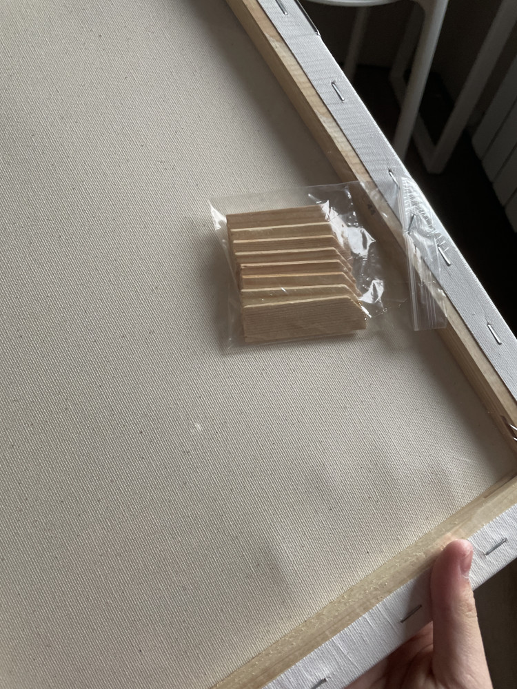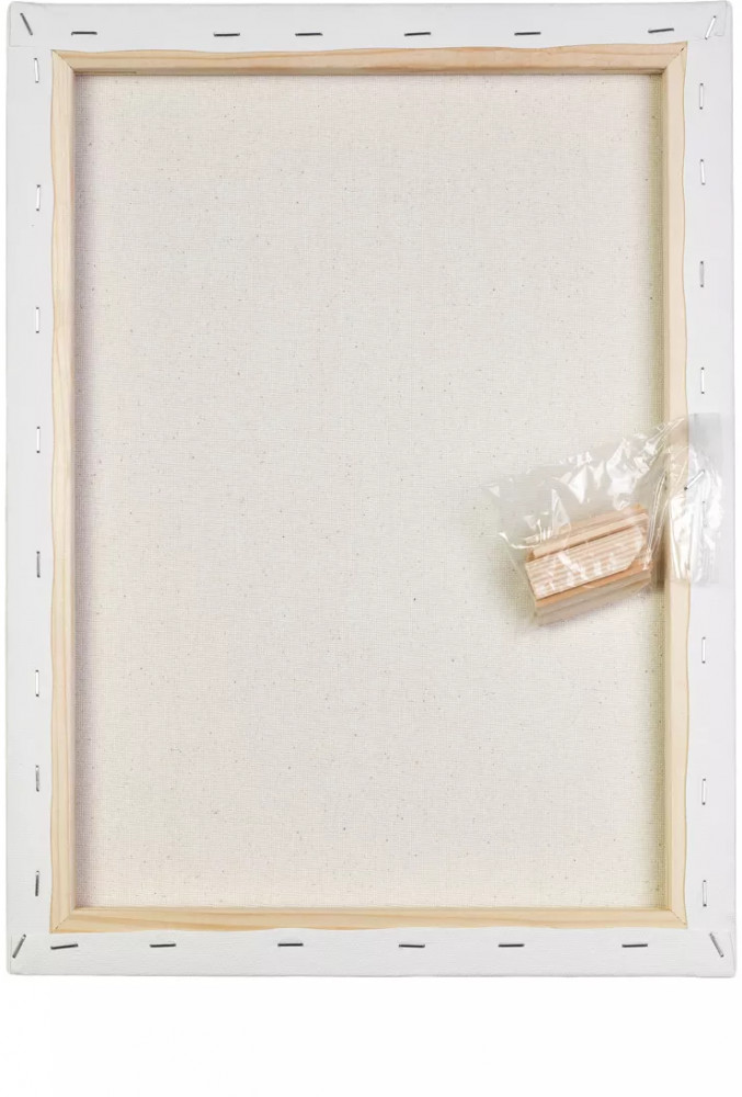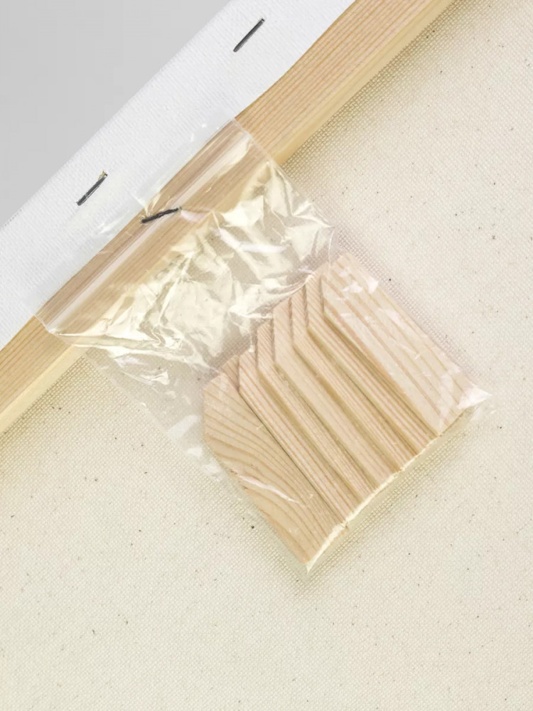 Есть деревянные подложки, если холст растянется в каком-то месте. Пришёл целый, нареканий нет