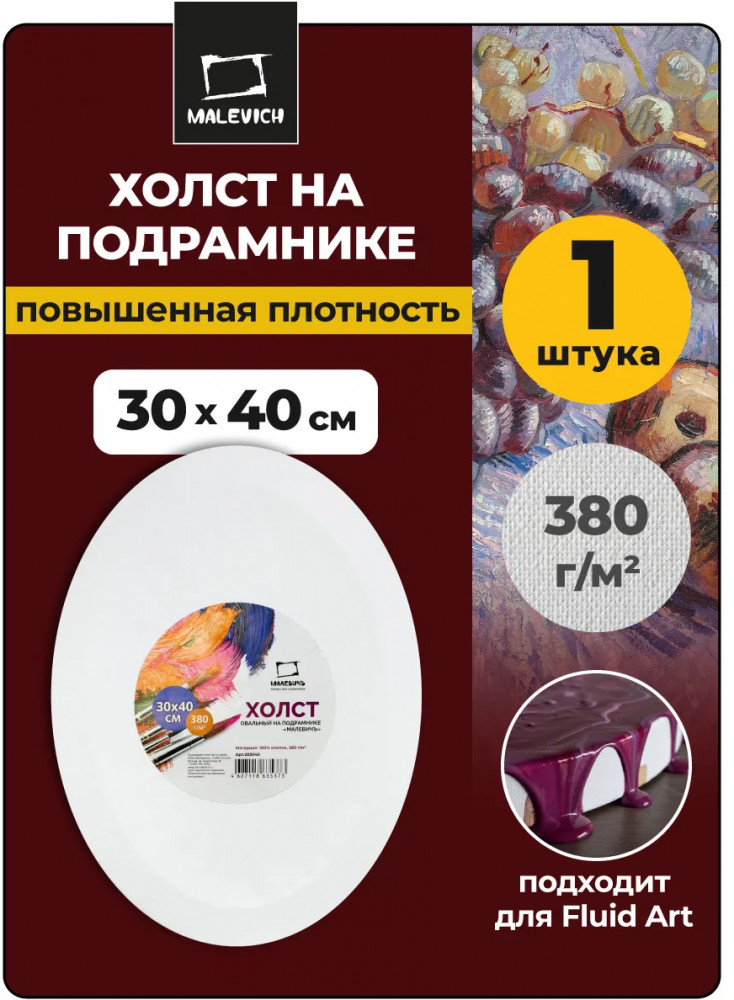 МалевичЪ Холст на подрамникеВ данный момент этот товар отсутствует в продаже. Возможно, у нас найдется аналогичный или похожий товар здесь. Профессиональный овальный холст плотностью 380 г/м² на подрамнике «Малевичъ» — полностью готовый к работе идеально грунтованный холст, успешно прошедший тестирование опытными художниками. Изготавливается из натурального хлопкового полотна. Повышенная плотность холста позволяет использовать его для картин большого формата. Холст — очень ровный, без узелков и неровностей. Он качественно натянут на овальный деревянный подрамник, не имеет дефектов в виде волн. Гладкая поверхность со среднезернистой фактурой удобна для предварительных набросков. В комплект входят клинья, позволяющие регулировать степень натяжения полотна. Подходит для масла, акрила, темперы и других художественных красок (кроме акварельных). |