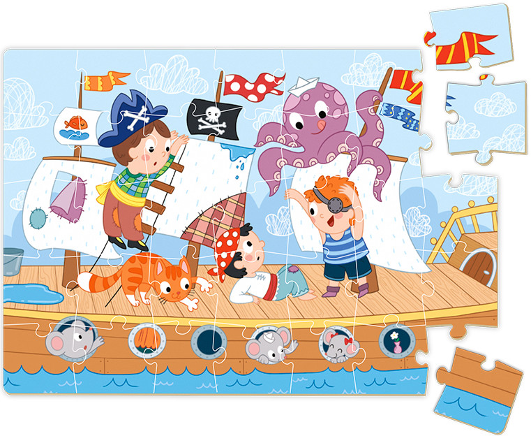 Пазл-мини «Морские приключения» представляет собой изображение веселой команды пиратов.