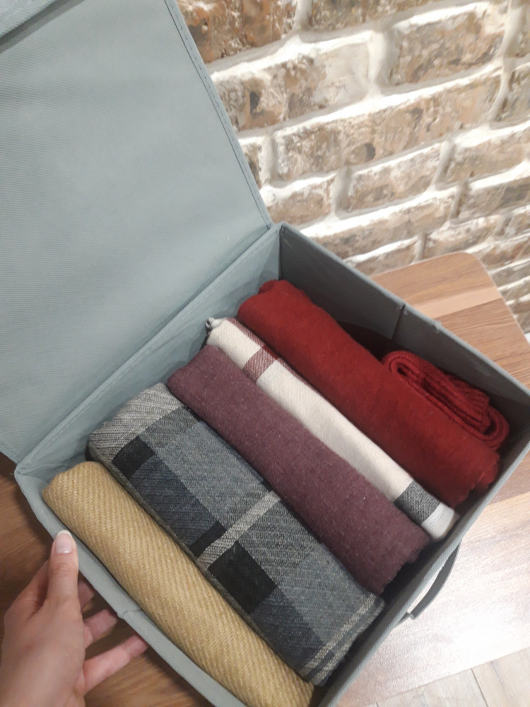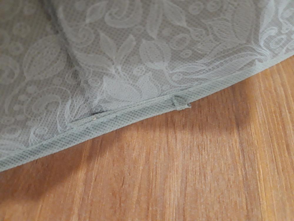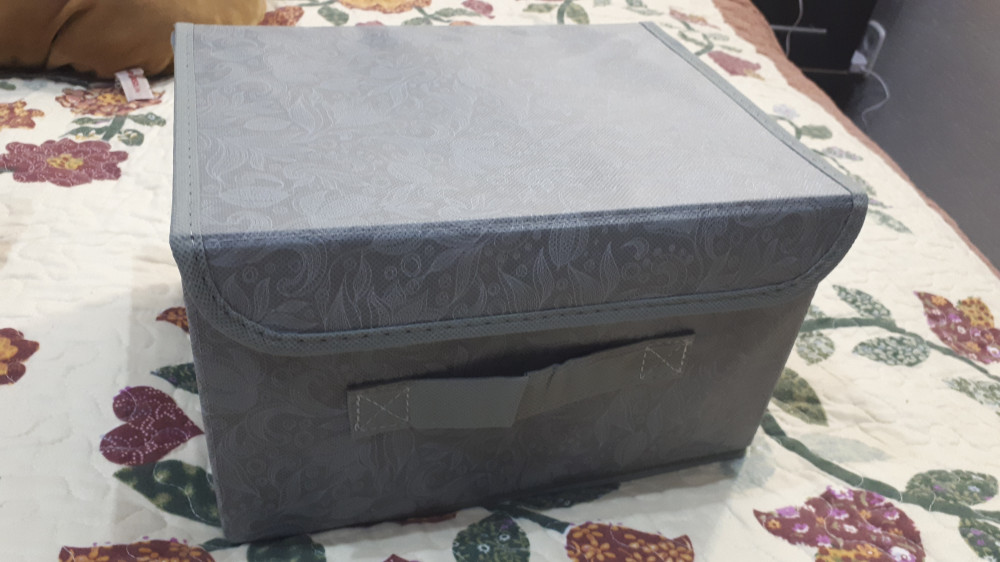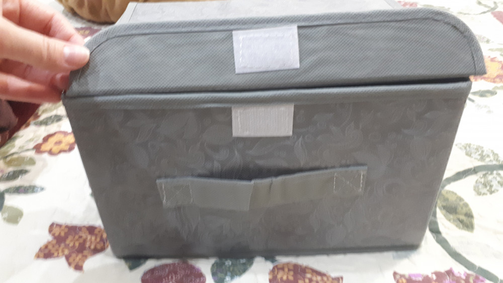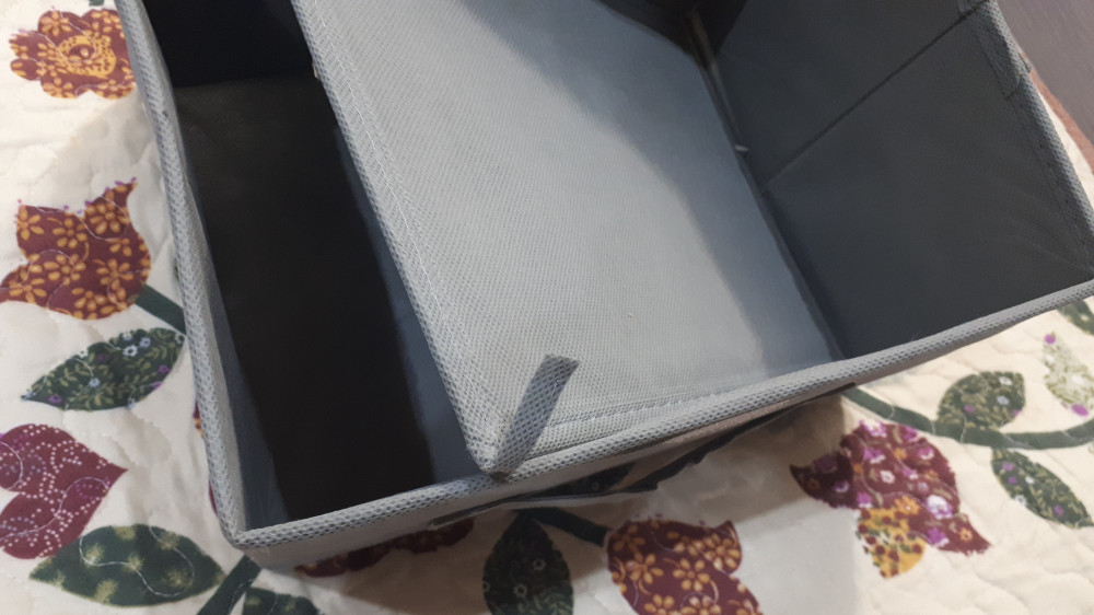 Вместительная коробочка, очень удобно, что крышка на липучках. 4 звезды ставлю за то, что плохо обработаны края и есть небольшая дырочка на оконтовке (фото прилагаю). На сайте цвет выглядит светлее, благороднее. В жизни грязновато серый.