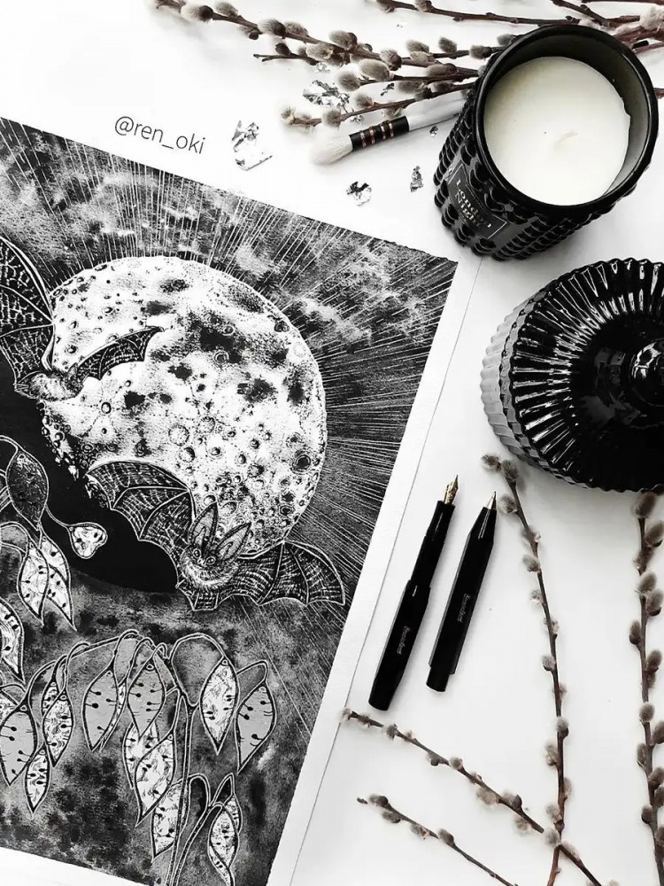 Я пока жду посылку с бумагой, которая специально предназначена для работы с тушью, а пока репетирую на обычной (разной) и вот тушь гамма с которой я начинал намного лучше себя ведёт, чем данный экземпляр. Для сравнения сфоткал на двух разных бумагах. И ещё минус для меня это то что она очень плохо смывается с рук и поверхности
