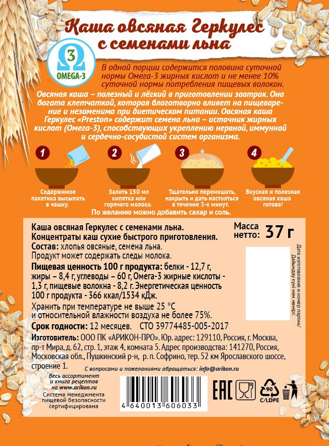 Вкусная каша с натуральным составом, семян льна много, размер порции получается большой, по сравнению с другими порционными кашами без варки.