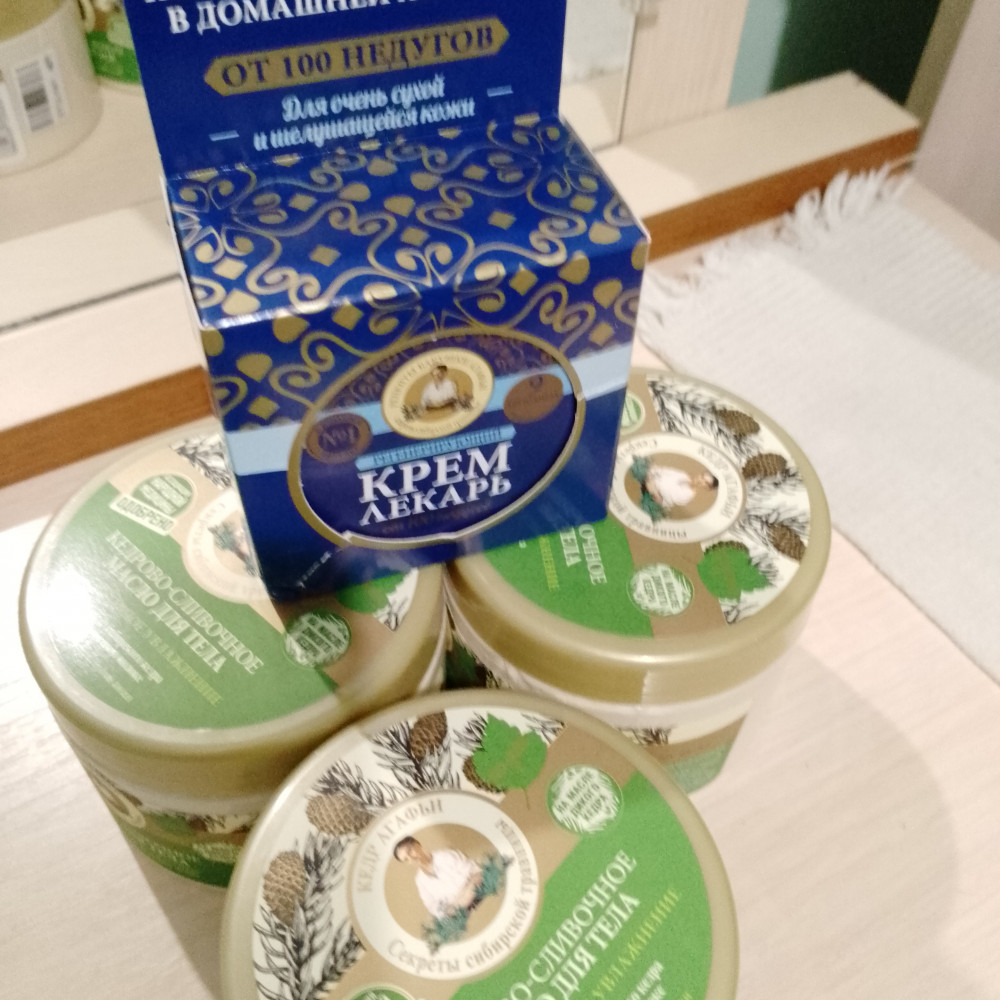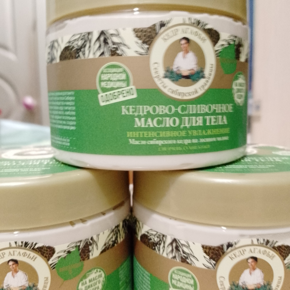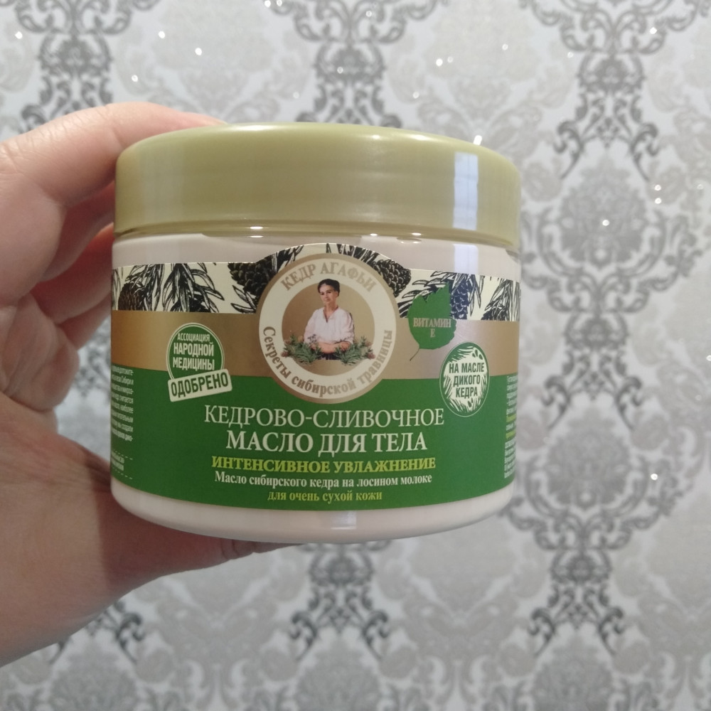 Аромат - бомба! Кто синим "Лекарем" Агафьи пользовался, оценят. Он сливочно-ореховый, сладковатый, похож на натуральный. Безвкусный на коже (информация для тех, кого целуют после душа). Это важно. =) Многие кремы для тела горьчат, и целоваться после них неприятно. Немного неудобно с круглой банкой. Консистенция густая, для такой тюбики больше подходят. Мне не хватает лопаточки, т.к. средство под маникюр попадает.