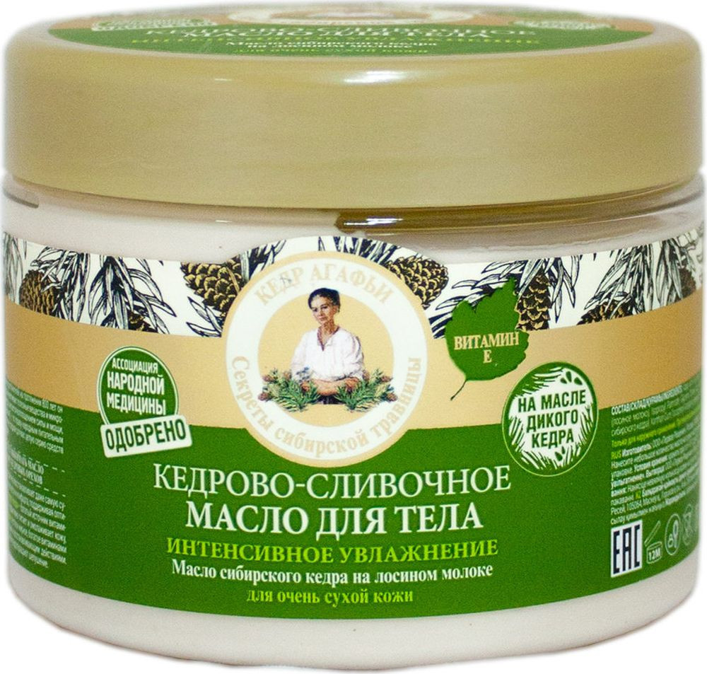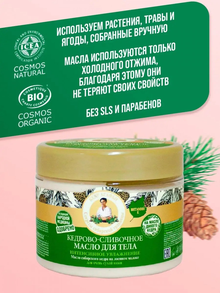 Рецепты Бабушки Агафьи Масло для тела увлажняющее с кедром и сливкамиприятный запах хорошее увлажнение густая текстура быстро впитывается В данный момент этот товар отсутствует в продаже. Возможно, у нас найдется аналогичный или похожий товар здесь. Густая формула кедрово-сливочного масла для тела восстанавливает даже самую сухую кожу, увлажняет её, придает ощущение мягкости и комфорта, поддерживая оптимальный уровень увлажнения. Масло сибирского кедра — богатый источник витамина Е и полиненасыщенных жирных кислот, эффективно питает и омолаживает кожу, делая ее мягкой и ухоженной. Лосиное молоко, густое и жирное, богатое витаминами и белками, обладает сильным тонизирующим и восстанавливающим действиями. Био протеины пшеницы ухаживают за кожей и предотвращают шелушение. |