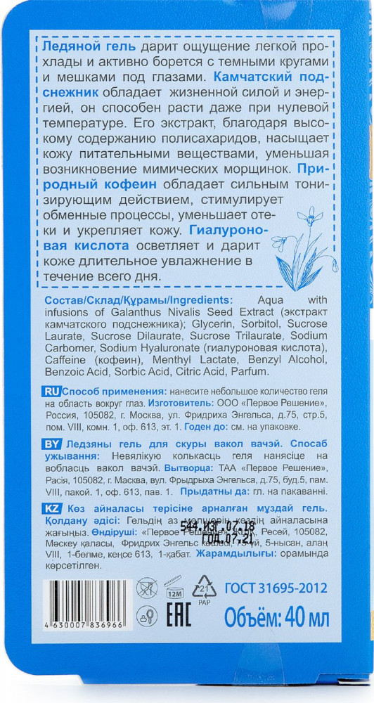 Гель для кожи вокруг глаз "Ледяной" замечательный! Действительно, отлично помогает снизить и частично убрать отёки вокруг глаз. У меня были даже двоёные отёки - вокруг глаз и под ними ещё немного отекало. Это "добавочное" вообще исчезло, а непосредственно вокруг глаз отёки немного, но уменьшились. Жалею, что не заказала больше одного тюбика. Надеюсь, что ещё появится в продаже. Помогает гель реально, пользуюсь месяц. Замечательный гель!!