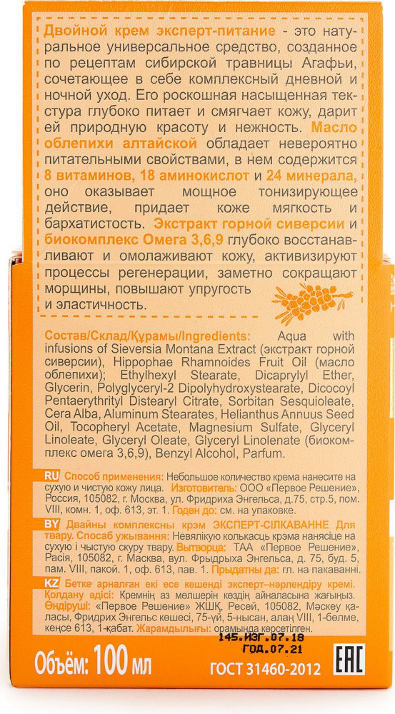 Рецепты Бабушки Агафьи Крем для лица эксперт-питаниеВ данный момент этот товар отсутствует в продаже. Возможно, у нас найдется аналогичный или похожий товар здесь. Двойной крем эксперт-питание — это натуральное универсальное средство, созданное по рецептам сибирской травницы Агафьи, сочетающее в себе комплексный дневной и ночной уход. Его роскошная насыщенная текстура глубоко питает и смягчает кожу, дарит ей ослепительную красоту и нежность. Масло облепихи алтайской обладает невероятно питательными свойствами, в нем содержится 8 витаминов, 18 аминокислот и 24 минерала, оно оказывает мощное тонизирующее действие, смягчает кожу, придает ей мягкость и бархатистость. Экстракт горной сиверсии и биокомплекс Омега 3, 6, 9 глубоко восстанавливают и омолаживают кожу, активизируют процессы регенерации, заметно сокращая морщины, повышают упругость и эластичность. |