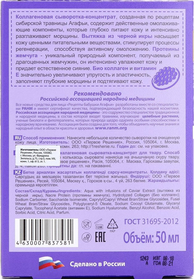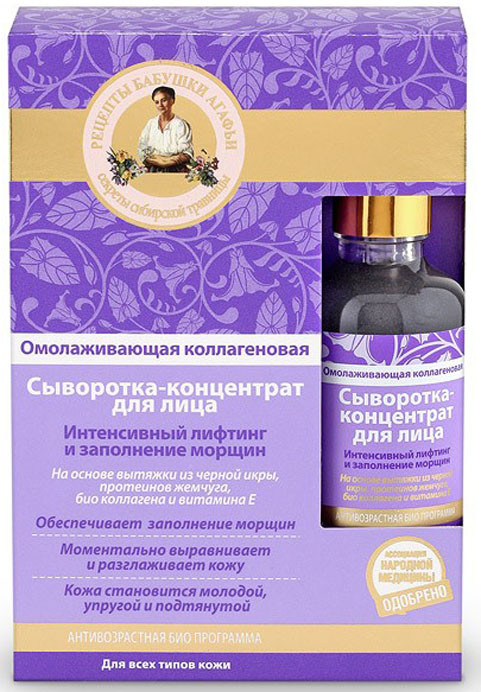 Рецепты Бабушки Агафьи Сыворотка-концентрат для лица коллагеновая «Интенсивный лифтинг и заполнение морщин»В данный момент этот товар отсутствует в продаже. Возможно, у нас найдется аналогичный или похожий товар здесь. Коллагеновая сыворотка-концентрат для лица Интенсивный лифтинг и заполнение морщин входит в обновленную серию косметики для ухода за лицом от бренда «Рецепты бабушки Агафьи». Эта сыворотка изготовлена на основе вытяжки из черной икры, протеинов жемчуга, био коллагена и витамина Е. Подходит для всех типов кожи. |