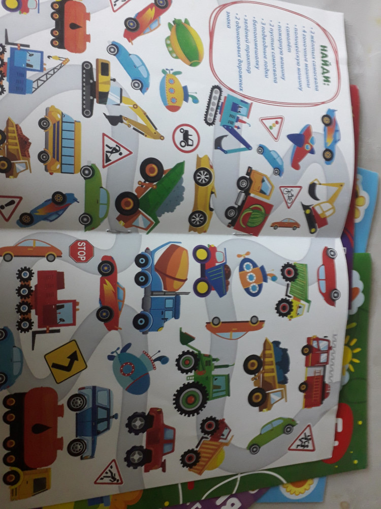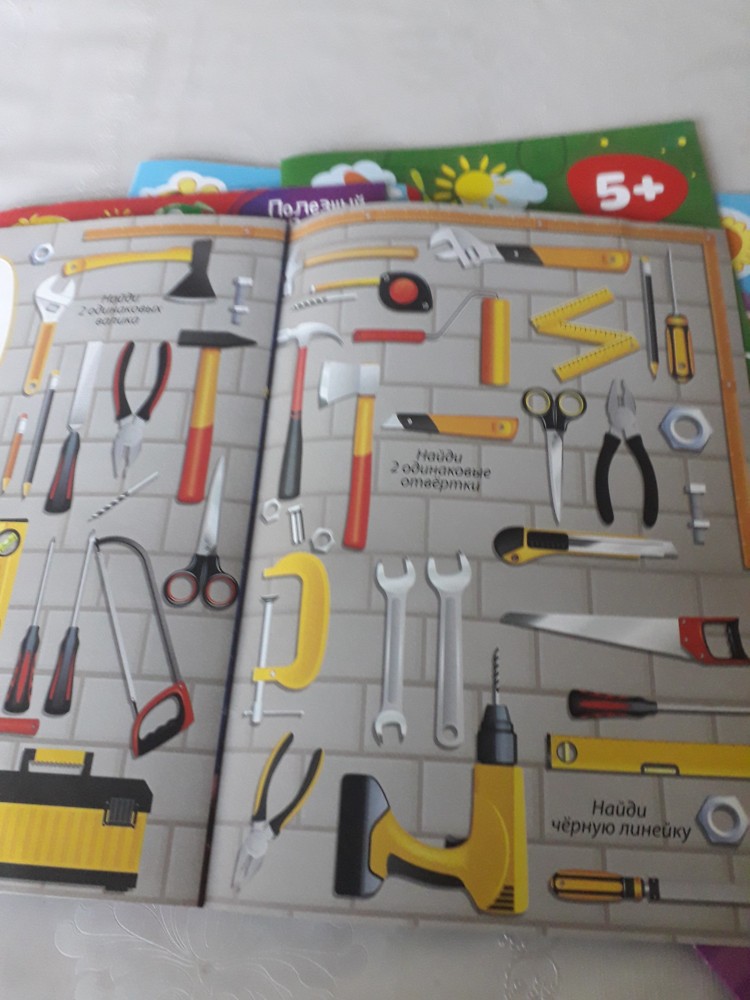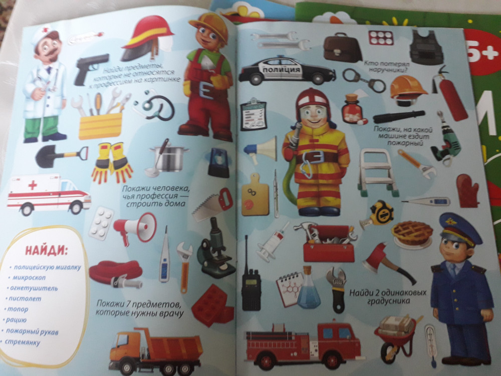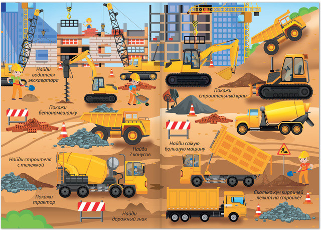 Очень красочная книжка, яркие рисунки. Для мальчиков самое то, тут и техника и инструменты. Моему младшему сыну 5 лет, ему очень понравилось искать нужную картинку, старшему 8, ему это конечно уже не интересно, слишком легко
