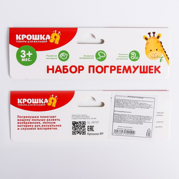 💳 Оплатить за товар можно при получении 🇰🇿 Есть бесплатная доставка по Казахстану от 1 дня 🎁 Копите бонусы с каждой покупки Серия: Счастливый малыш Эти яркие и забавные погремушки обязательно понравятся малышам! Погремушки развивают слуховое, зрительное восприятие, мелкую моторику, координацию движений и наглядно-действенное мышление. Сначала малыш реагирует на звук погремушки и учится фокусировать на ней взгляд. Позже, когда кроха чуть-чуть подрастет, он научится захватывать погремушку пальчиками, тренируя мелкую моторику. После приобретения этого навыка ребенок переходит к освоению нового действия — он пробует сам греметь погремушкой, совершенствуя координацию движений. |
