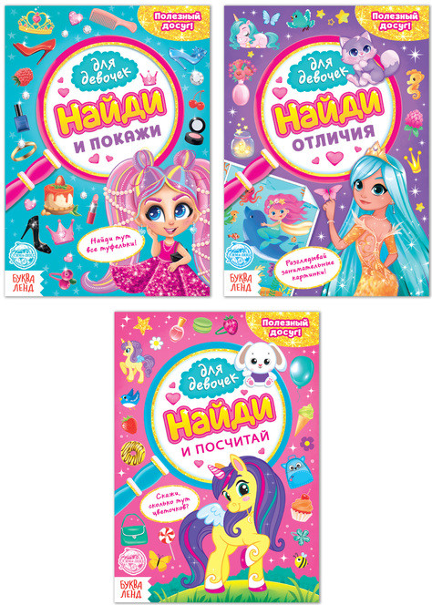 Книги для девочек «Найди и покажи» — это комплекс типовых детских упражнений, представленных в наборе трех изданий. Упражнения развивают у ребёнка память, скорость реакции, смекалку, воображение, внимание, мелкую моторику рук, визуальное восприятие. |