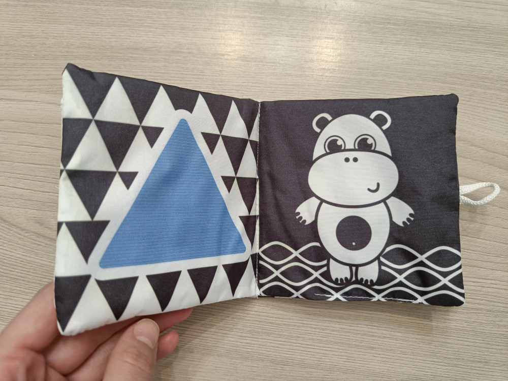 Хорошая книжечка, правда разворота всего 4. Шуршит обложка, сшито все хорошо, ребенок( 3 мес) "залипает" и внимательно рассматривает рисунки.