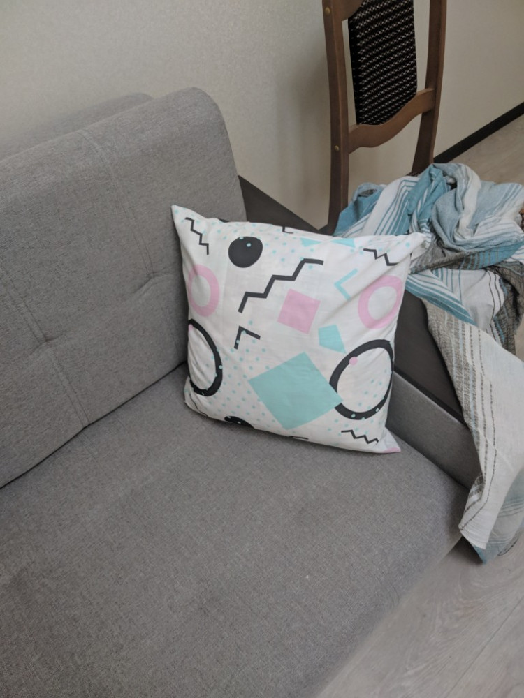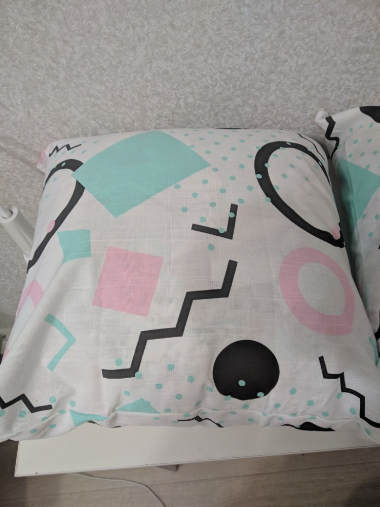 Наволочка просвечивает немного, на фото видно рисунок напарника. реальный размер 43х43см. молния узкая, с каждой стороны 5 см не хватает, подушку еле запихнул. качество вроде хорошее.