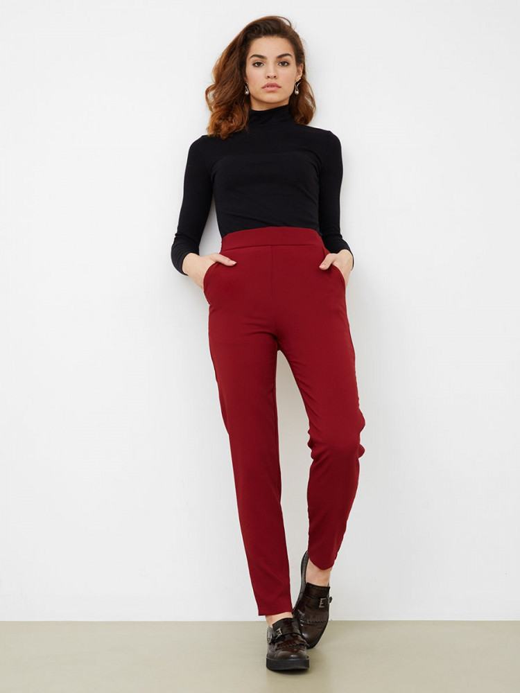 Бордовые брюки. На размер бёдер 107 см взяла 46 размер (ориентировалась на таблицу размеров) - ВЕЛИКО. причём на размер. Нужно было брать 44. Тем более материал стрейч. Цвет бордо немного темнее чем на фото, более баклажановый оттенок. Ткань тонкая, на лето. В целом брюки хорошие