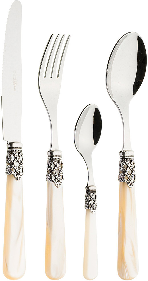 «Ginevra Ivory» — коллекция столовых приборов, изготовленная из нержавеющей стали 18/10. Ручки выполнены из акрила в перламутровых тонах, украшены изысканной серебряной отделкой.