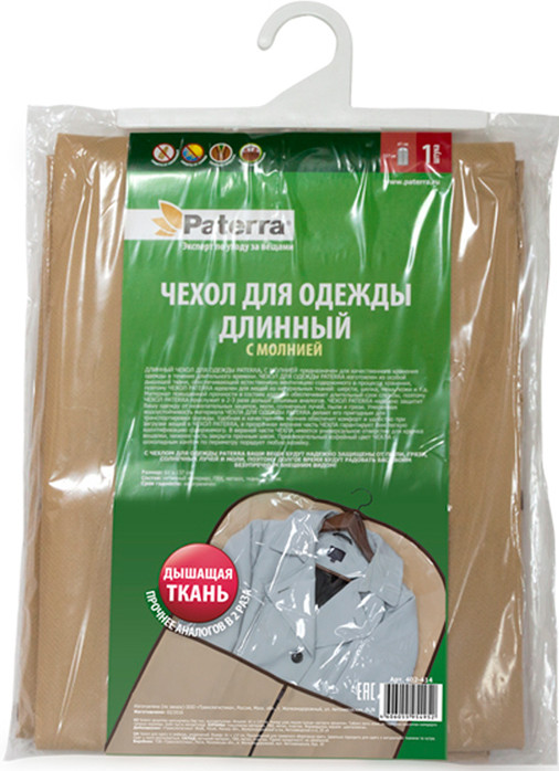 Чехол «Paterra» предназначен для длительного хранения одежды. Изготовлен из «дышащей» ткани (спанбонд), которая обеспечивает хорошую вентиляцию одежды даже при длительном хранении. Изделие идеально подходит для одежды из натуральной ткани и меха.