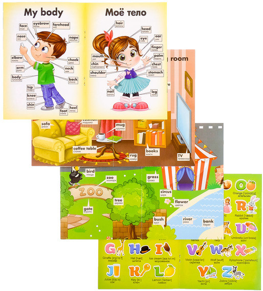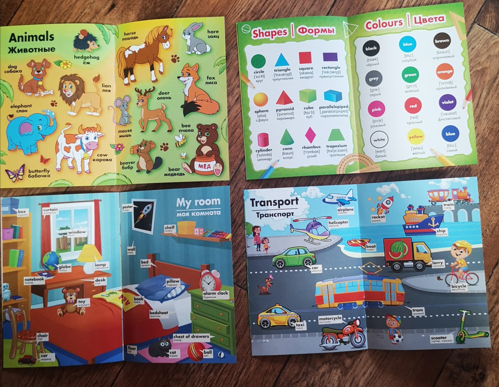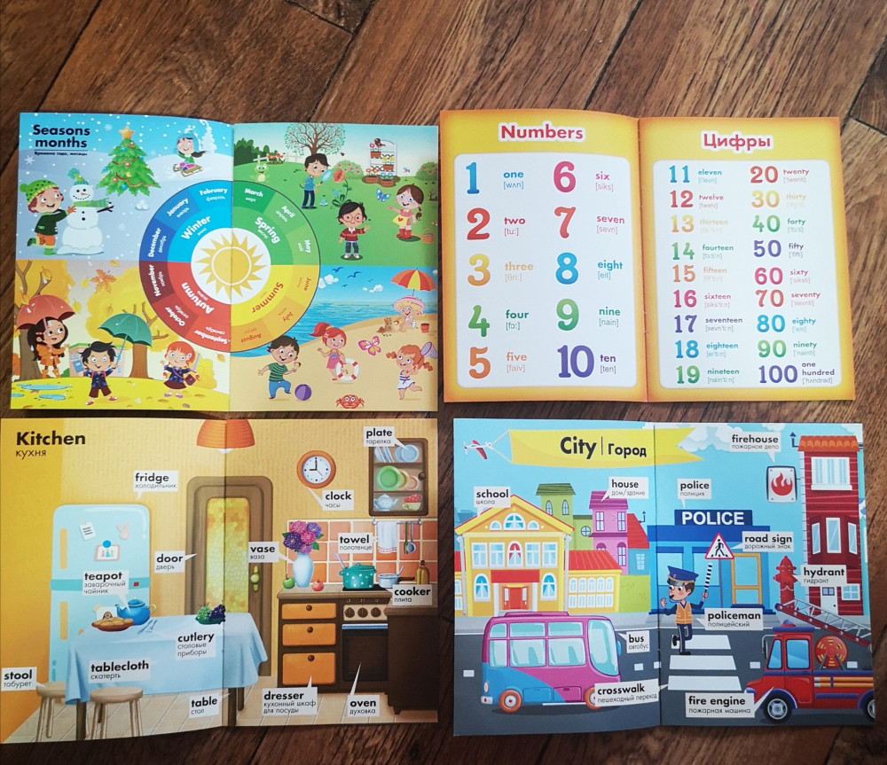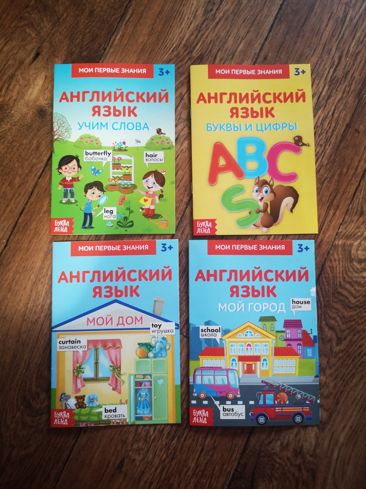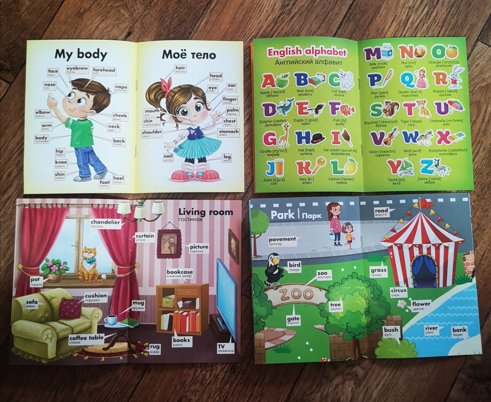 Отличные книжки, есть абсолютно всё для начала изучения английского языка. Алфавит, цифры, формы, цвета, части тела, животные, транспорт, домашние предметы и другое. Приятно удивлена качеством и содержанием. Картинки очень красивые и приятные глазу, понятные ребенку. Размер книг небольшой, но для ребенка самое то.