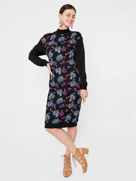 Я покупала платье в черном цвете, по акции. Это просто находка. Тем более, что платье замечательное. Само платье - тканный трикотаж, рукава - плотный материал, наподобие шифона, только плотнее. Манжеты, ворот и низ подола-вязанный трикотаж. При носке ощущение полного комфорта. Что называется не давит, не жмет, не трет. Но это если точно подобран размер. Я купила 50 размер. Этому размеру и соответствует.