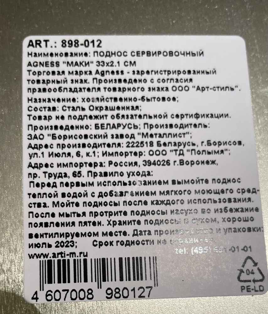 Agness Поднос сервировочный-40% +27 красивый рисунок хорошее качество практичный тонкий металл