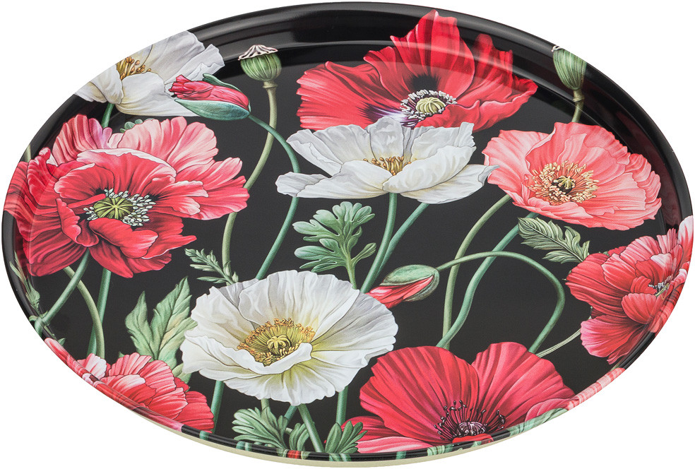 Из серии "Маки" купила металлический поднос и стеклянную тортовницу, качество хорошее, рисунки яркие, как на фото
