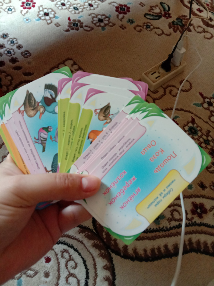 Карточки ужасного качества, размер меньше пачки сигарет. Идея сама по себе хорошая, с одной стороны картинка, а с другой задание