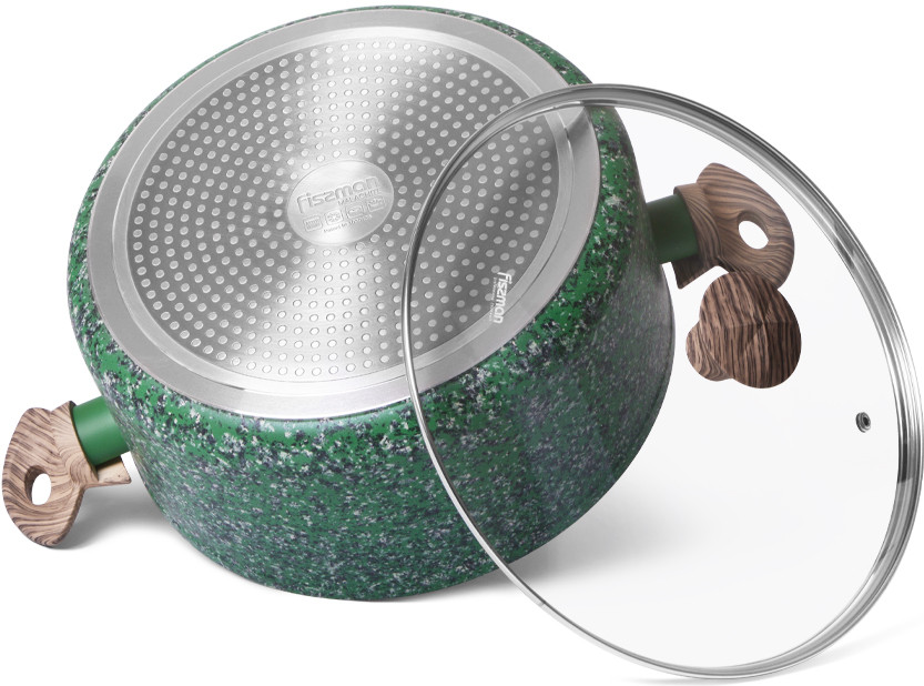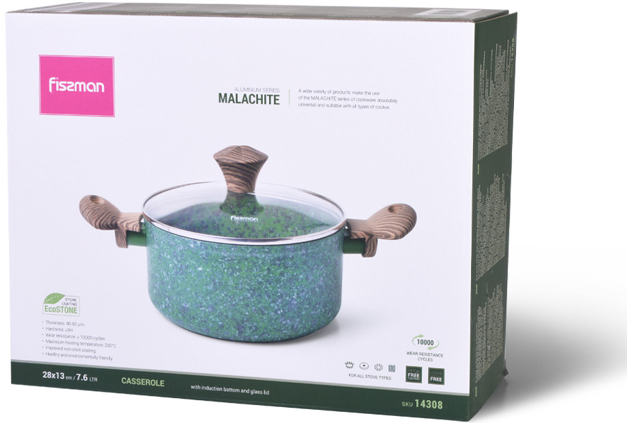 Серия посуды Malachite с уникальным гранитным покрытием EcoStone собственной разработки Fissman, выполненная в глубоком зелёном цвете с крупными белыми и черными пятнами, обладает высочайшей прочностью, термостойкостью и устойчивостью к истиранию и коррозии.