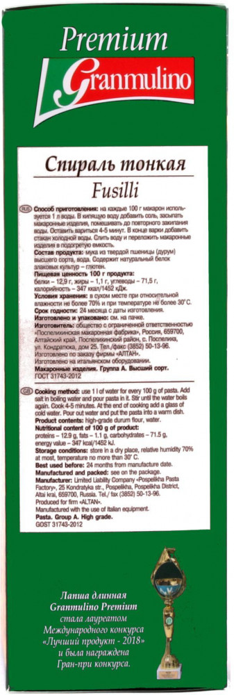 Макароны Granmulino производятся из твердой пшеницы Durum, выращенной в самом экологически чистом регионе России — на Алтае. |