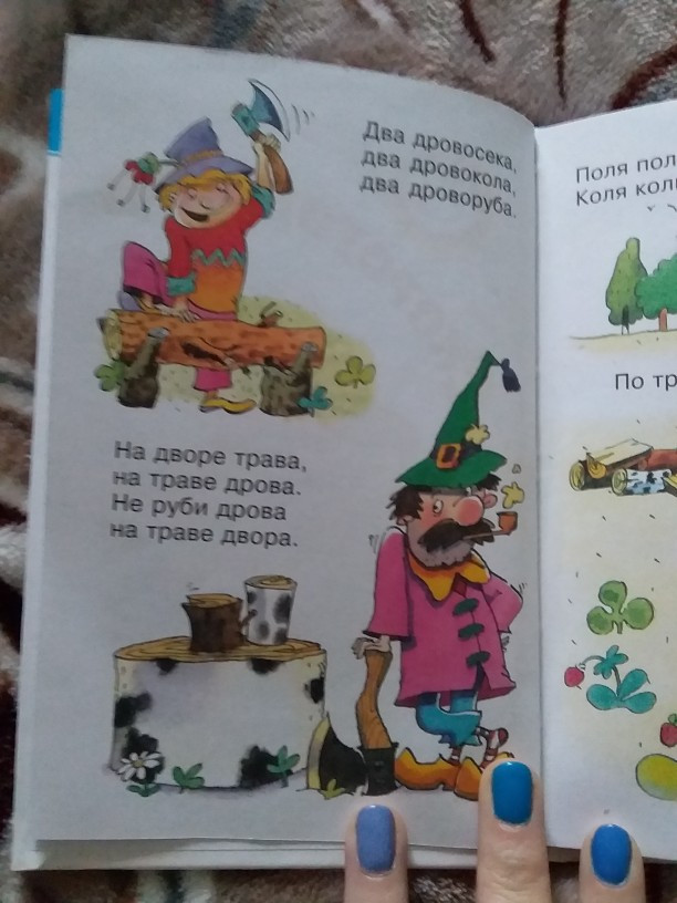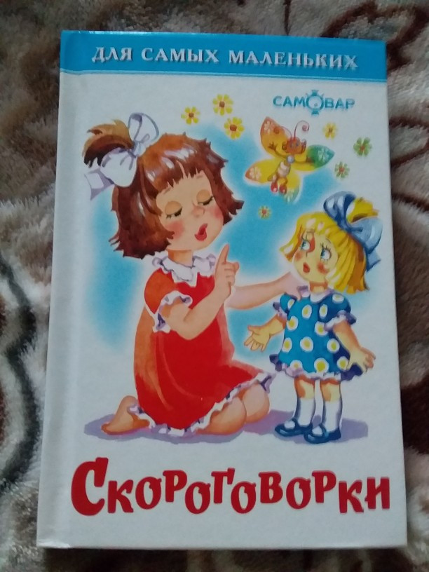 Хорошая книжка. Размер маленький (что-то между А5 и А6), зато в ней собрано большое количество разных скороговорок. Картинки, в основном, приятные взору. Подобранные скороговорки было очень удобно разучивать с ребёнком 3-х лет.